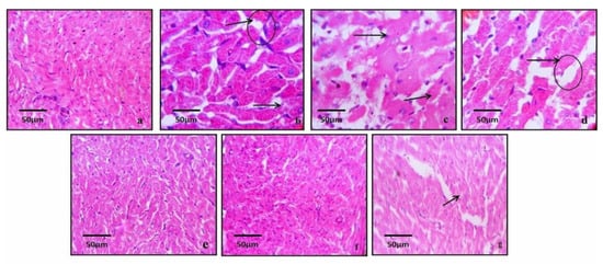 Results showed normal morphological features in the normal control group. The morphological appearance in PHC6 and PHC10 treated groups was comparable to the that in the standard carvedilol group, while the STZ + HFD (D-HFD-C) treated rodents showed tissue damage, disaggregation, vacuolation and degenerative changes in heart tissue, as displayed in Figure 9a and accordingly the grading of cardiac tissues was done as shown in Table 5, where the highest level cardiac tissue damage corresponds to Grade 4 and least to Grade 1.