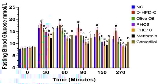 Fasting blood glucose level for OGTT. All values are expressed as mean ± SD (n = 6) analyzed by one-way ANOVA followed by Tukey’s t-test. D-HFD-C was compared with NC (# p < 0.0001), and the values were found to be highly significantly different. The different treatment groups were compared with D-HFD-C and the results were found to be different at the following significance levels: c p < 0.01; b p < 0.001; a p < 0.0001 from the respective disease control groups. NC is normal control; D-HFD-C is diabetic high-fat diet control group; PHC6 and PHC10 are the polyherbal combination treated groups.].