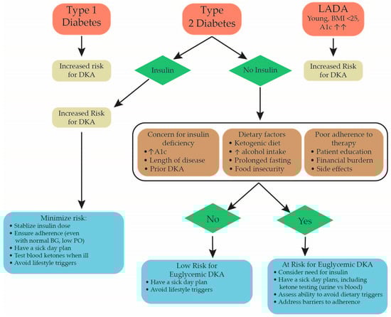 Flow chart showing factors to consider when determining a patient’s risk for developing euglycemic DKA when starting an SGLT2 inhibitor. Strategies to help minimize a patient’s risk based on their unique characteristics are also discussed [,]. DKA = diabetic ketoacidosis, A1c = hemoglobin A1c, BG = blood glucose.