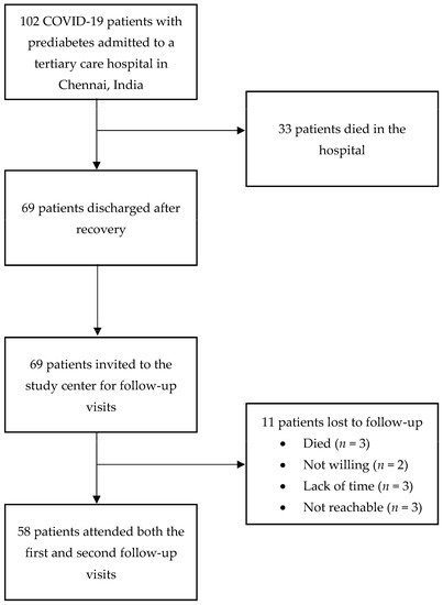 Figure 1 shows the recruitment and follow-up of patients for the study. We recruited all 102 COVID-19 patients with prediabetes (aged ≥ 18 years) who were admitted to a tertiary care hospital in Chennai, India, between May and October 2020. Of these 102 patients, 33 (32.4%) died in the hospital, and the remaining 69 (67.6%) were discharged alive after recovery. We conducted phone calls to invite these 69 patients to the study center for a monthly follow-up visit. Of the cohort of 69 patients, 58 (84.1%) attended both follow-up visits, while the rest 11 (15.9%) were lost to follow-up: 3 died before the first follow-up visit, 2 were unwilling to participate, 3 did not have time to participate, and 3 were unreachable. The diagnosis of COVID-19 was made by a positive reverse transcription polymerase chain reaction (RT-PCR) test, or chest computed tomography (CT) findings and/or clinical signs and symptoms consistent with COVID-19 infection. Prediabetes was defined as an HbA1c of 5.7–6.4%, as per the American Diabetes Association criteria [13], with no previous history of diabetes.