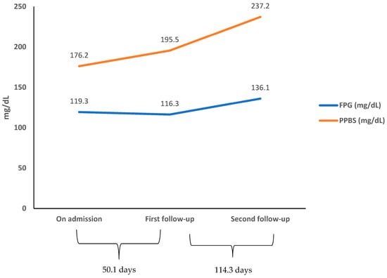 Changes in glucose levels from hospital admission to first and second follow-up visits. FPG—fasting plasma glucose; PPBS—post-prandial blood sugar.