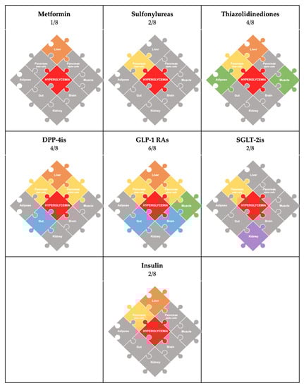 To recap, the ideal combination therapy should be effective at treating all eight pathways: the liver (decrease in hepatic glucose production), pancreas (increase in insulin secretion, decrease in glucagon secretion), muscle (increase in glucose uptake), adipose (decrease in lipotoxicity), gut (increased incretin effect), brain (neurotransmitter regulation, decrease in appetite), and kidneys (decrease in glucose reabsorption) [55]. This is depicted in Figure 2, in which each drug class is color-coded based on the organ-related puzzle piece that it targets.