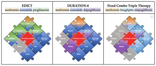This figure highlights the pieces of the pathophysiology addressed by the trials EDICT and DURATION-8 compared to the use of a fixed-combination therapy (Trijardy). The colored gradients show the effect of specific drug classes on each of the pathways. The gray pieces indicate the pathways that are not addressed by that particular combination. In the center is the main treatment target: hyperglycemia.
