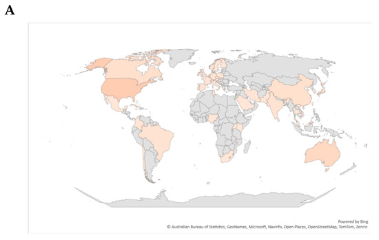 Global distribution of registered trials per country. (A) depicts a global map color-coded with strong-shaded regions describing a high number of trials registered in that specific region. (B) demonstrates the distribution of trials per country. Briefly, the United States registered the most clinical trials, while other regions like Australia, the United Kingdom, and multiple countries trials recorded 10%, 7%, and 9%, respectively. (C) gives an overview of the distribution of trials across different clinical trial registries. Briefly, some of the listed registries included Australian New Zealand Clinical Trials Registry (ANZCTR), International Standard Randomized Controlled Trial Number (ISRCTN), Japan Primary Registries Network (JPRN), Iranian Registry of Clinical Trials (IRCT), Peruvian Clinical Trials Registry (REPEC), Sri Lanka Clinical Trials Registry (SLCTR), Cuban Public Registry of Clinical Trials (RPCEC), International Traditional Medicine Clinical Trial Registry (ITMCTR), Clinical Research Information Service of the Republic of Korea (CRiS), Thai Clinical Trials Registry (TCTR), Chinese Clinical Trial Register (ChiCTR), and the Clinical Trials Registry India (CTRI).