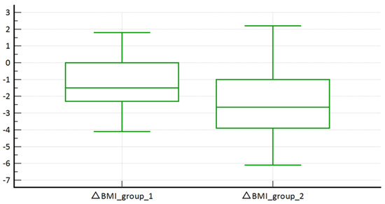 Comparison between SCORE2-Diabetes low + medium (above SCORE2-Diabetes group 1) vs. SCORE2-Diabetes high + very high risk (below SCORE2-Diabetes group 2) groups in terms of △BMI.