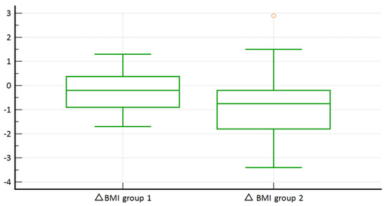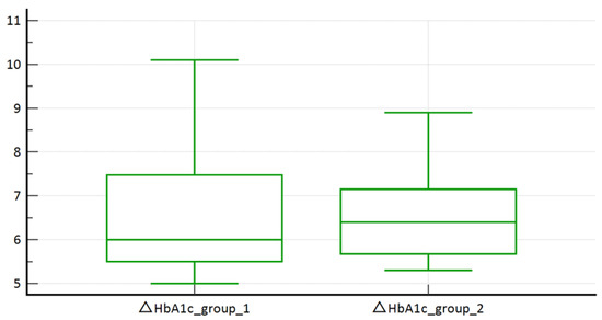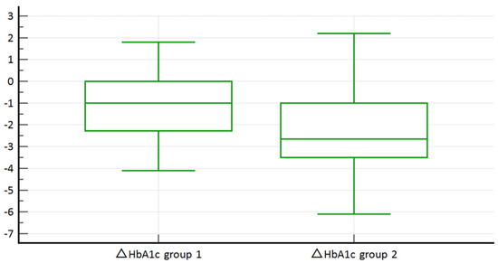 SCORE2-Diabetes high + very high (N = 38) risk group, when compared to SCORE2-Diabetes low + medium (N = 19), had statistically better results in terms of △BMI (−2.4 ± 2.0 kg/m2 vs. −1.1 ± 1.6 kg/m2, p = 0.039; Figure 3), △BW ≥ 5% (57.9% vs. 21.0%, Χ2 = 6.831, p = 0.009), and △HbA1c (−0.9 ± 1.2% vs. −0.2 ± 0.9%, p = 0.028; Figure 4). However, no statistically significant difference was found in terms of △BW ≥ 3% (73.7% vs. 47.4%, Χ2 = 3.780, p = 0.052) and △BW ≥ 10% (18.4% vs. 5.3%, Χ2 = 1.770, p = 0.183).
