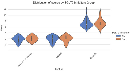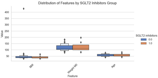 Figure 8 shows that there is no significant difference in the intake of SGLT-2 inhibitors, concerning age, BMI, weight or the three scores. A Mann–Whitney U test confirmed this.