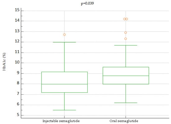 Baseline HbA1c levels are shown in Figure 1. There was a difference in baseline HbA1c values between the injectable semaglutide group and the oral semaglutide group [median 8.0 (5.5–12.7 range) versus 8.80 (6.2–14.2)%, p = 0.039].