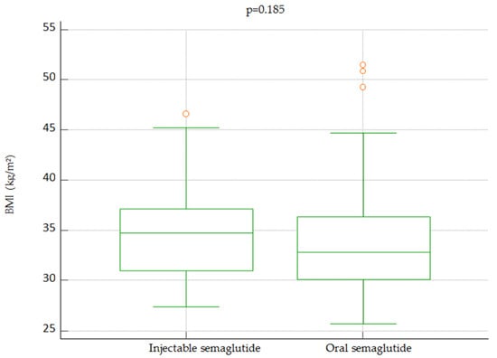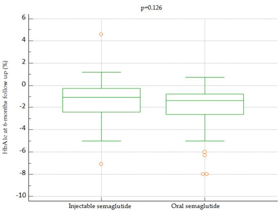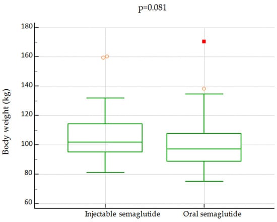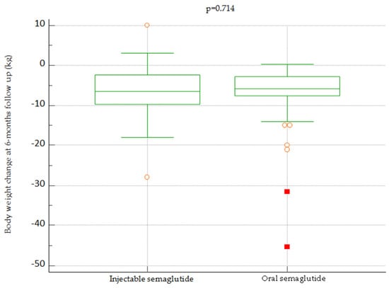 At 6-month follow-up, no difference in body weight was observed between the injectable semaglutide group and the oral semaglutide group [median −6.50 (−28.0–10.0 range) vs. −5.90 (−45.3–0.2) kg, p = 0.714], as shown in Figure 5.