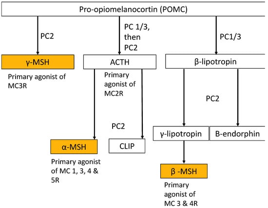 - Harno, E.; Ramamoorthy, T.G.; Coll, A.P.; White, A. POMC: The Physiological Power of Hormone Processing. Physiol. Rev. 2018, 98, 2381–2430. [Google Scholar] [CrossRef] [PubMed]