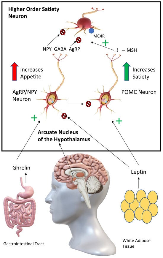 Perhaps the most obvious link between melanocortins and metabolism is their effect on energy homeostasis via hunger reward pathways in the brain (see Figure 3). Appetite and food intake is controlled in the arcuate nucleus of the hypothalamus by the competing actions of pro-opiomelanocortin (POMC) and agouti-related peptide/neuropeptide Y (AgRP/NPY) neurons [15]. Activation of POMC neurons leads to anorexigenic effects, while activation of AgRP/NPY neurons leads to orexigenic effects. The way this system functions after a meal is as follows: leptin, which is produced by adipocytes and enterocytes, activates POMC neurons in the arcuate nucleus [16]. This leads to the release of melanocortins (predominantly α-MSH) from POMC neurons which activates melanocortin receptors (predominantly MC4R) on higher order satiety neurons. Satiety and the desire to perform physical activity are increased. In post-prandial periods, the AgRP/NPY neurons act as antipodes of POMC neurons, leading to unpleasant hunger pains. Ghrelin, a hormone produced by the enteroendocrine cells, activates AgRP/NPY neurons in the arcuate nucleus [17]. These neurons, in turn, release AgRP, NPY and GABA (gamma-aminobutyric acid) to antagonise, directly and indirectly, higher-order satiety neurons and their receptors (e.g., MCR4), leading to hyperphagia. AgRP/NPY neurons also directly inhibit the release of melanocortins from POMC neurons during post-prandial periods. Agouti-related protein/peptide (AgRP) is a neuropeptide synthesised by the cell bodies of AgRP/NPY neurons in the ventromedial arcuate nucleus in the brain. Agouti protein is a paracrine competitive antagonist of MC1R and MC4R. The effect of this blockage is hyperphagia, obesity and eventual type II diabetes [18]. Therefore, providing exogeneous melanocortins is likely to correct hyperphagia and restore satiety.
