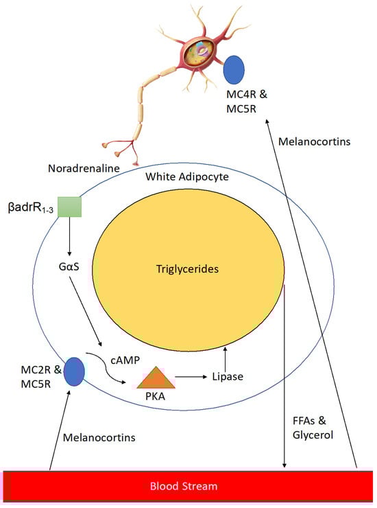 Stimulation of Lipolysis in white adipose tissue (WAT) by melanocortins. Melanocortins stimulate lipolysis in peripheral white adipose tissue through two related, yet distinct processes. In the first process, following stimulation by melanocortins (including α-MSH) at cell surface G-protein coupled receptors (MC2R & MC5R), an intracellular signalling pathway is mediated through cAMP and protein kinase (PKA), leading to the release of the lipolytic enzyme lipase, which in turn breaks down triglycerides into free fatty acids (FFAs) and glycerol which are then exported into the bloodstream to be metabolised. In the second process neurons innervating WAT are activated by melanocortins through MC4R & MC5R to release noradrenaline. Noradrenaline activates β 1-3-adrenergic receptors (βadrR1-3) leading to a similar intracellular signalling cascade as the first process.