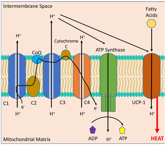 Thermogenesis in the mitochondrion of a Brown Adipocyte. Melanocortins stimulate the activation of uncoupling protein 1 (UCP-1) via sympathetic stimulation of neurons innervating Brown Adipose Tissue (BAT) to uncouple the electron transport chain (consisting of C1, C2, Co-enzyme Q, C3, Cytochrome C and C4) from converting adenosine diphosphate (ADP) to adenosine triphosphate (ATP) through ATP Synthase to instead producing heat from fatty acids, leading to reduced body weight.