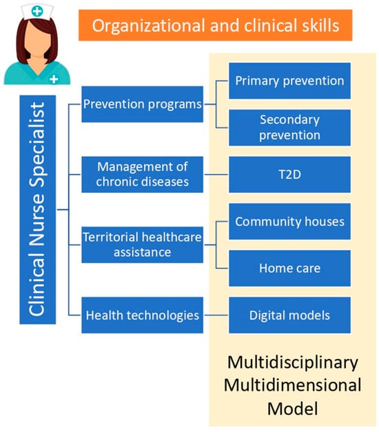 In Italy, these care development programs have led to an increased focus on community healthcare, an essential factor for managing chronic conditions like T2D. Consequently, proximity care and community nursing have undergone significant development. Patients are integrated into a socio-assistance community approach, emphasizing the centrality of the individual and the integration of “Hospital–Community” models. The FCNs become key figures in this context, capable of providing personalized care and coordinating with new community healthcare services such as “Community Houses”. The organizational skills acquired by the FCNs also enable them to manage new healthcare technologies, interact effectively with digital data collection and monitoring models, and actively participate in the implementation of modern organizational models from a Health Technology Assessment (HTA) perspective [28,29] (Figure 1).