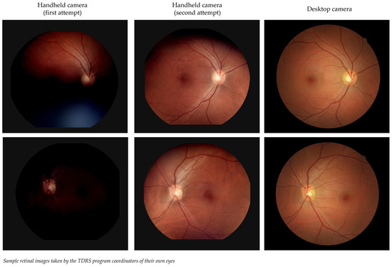 Third, while the camera model has an automatic function (i.e., once focused on a fixed target, it can capture the image clearly), photographers had a hard time maneuvering the device accurately or quickly enough for the function to work. Thus, most images from the pilot study were captured manually; this, unfortunately, came at a cost of lower quality images, as even the slightest movement of the handheld model, such as manually pressing the button to capture the image, led to loss of focus and a suboptimal image. Even when the TDRS program coordinators tried capturing images of each other as model patients (i.e., staying still, not blinking, opening their eyes as wide as possible, focusing their gaze in the exact fixation needed for each image), the image quality remained low. Paradoxically, these suboptimal images undermine the intended convenience of the handheld cameras—i.e., because of the poor image quality of the handheld image sets, many patients at the site where only the handhelds were used were later asked to return for a follow-up screening using desktop cameras.