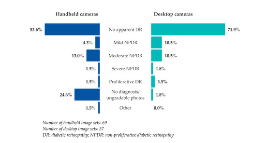Image readers were less likely to arrive at a diagnosis based on handheld camera image sets compared to desktop camera image sets (Figure 3). About a quarter (24.6%) of handheld image sets were given no diagnosis or were deemed ungradable, compared to 1.8% of desktop image sets. The diagnoses of no apparent DR, mild non-proliferative DR (NPDR), severe NPDR, and proliferative DR were all lower in percentage among the handheld image sets than for the desktop image sets. However, the diagnosis of moderate NPDR was slightly higher among handheld image sets than among desktop image sets.