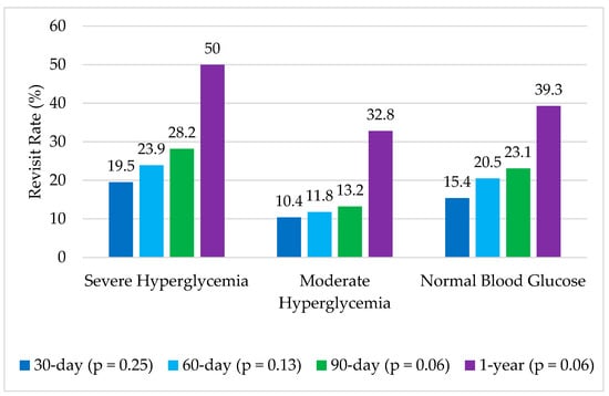For the primary outcome of 30-day hospital revisits, a total of 48 (16%) patients had a revisit within 30 days—23 (19.5%) in the severe hyperglycemia cohort, 7 (10.4%) in the moderate hyperglycemia cohort, and 18 (15.4%) in the normal BG cohort. However, these differences were not found to be significantly different (