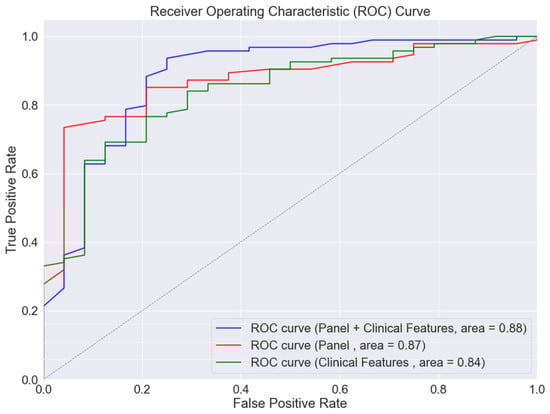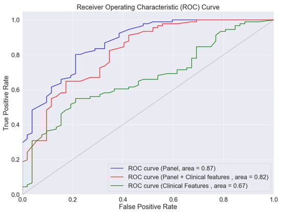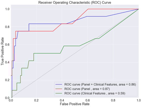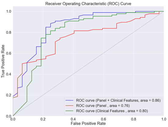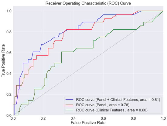 Based on findings from the discovery phase, we further investigated the ability of the five-protein panel to diagnose PAD in diabetic patients. The random forest model exhibited the following performance metrics for diagnosing PAD using different input features: clinical characteristics alone (AUROC 0.84), five-protein panel alone (AUROC 0.87), and clinical characteristics combined with the five-protein panel (AUROC 0.88). The addition of the protein panel significantly enhanced the model’s performance compared to using clinical characteristics alone, resulting in a Net Reclassification Index (NRI) of 0.28. This improvement was statistically significant, with a p-value of 0.027 (Figure 1).