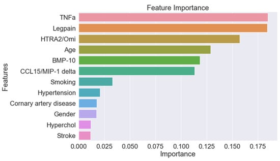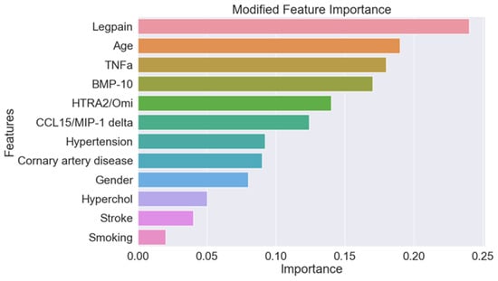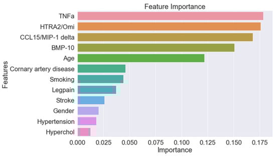 Next, a random forest model was trained using input features of clinical characteristics (age, gender, history of hypertension, dyslipidemia, diabetes, past/current smoking, congestive heart failure, coronary artery disease, previous stroke, claudication, ABI, ASA, statins, ACE-i/ARB, B-Bl, CCB, hydrochlorothiazide (HCTZ) or furosemide, oral antihyperglycemic agent, and insulin), the five-protein panel, and clinical characteristics combined with the five-protein panel. The model was assessed using net reclassification improvement (NRI) to quantify the model’s ability to reclassify subjects [24]. After training, the models were further assessed by calculating the area under the receiver operating characteristic curve (AUROC). The importance of predictive features was calculated using the variable importance (gain) score, which indicates the predictive impact of a specific covariate [25].