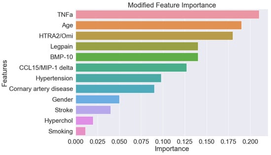 Importance of input features for predicting need for vascular surgery at 2 years with the random forest model. TNFa: tumor necrosis factor alpha, HTRA2/Omi: HTRA2, also known as Omi, CCL15/MIP1 delta: chemokine (c-c motif) ligand 15/macrophage inflammatory protein 1 delta.