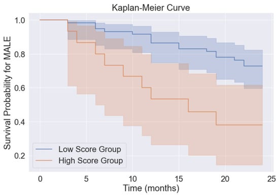 Each patient was assigned a specific score based on protein concentration, and the overall cohort was divided into high and low score groups. Kaplan–Meier analysis demonstrated that the high score group effectively stratified patients for MALE risk (p = 0.007; log rank = 7.18). MALE-free survival rates at 1 year and 2 years were 88% and 72%, respectively, in the low score group, and 57% and 41%, respectively, in the high score group (Figure 10).