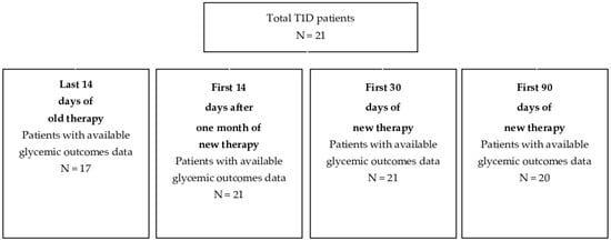 A total of twenty-one T1D patients were included in this analysis. Prior to switching to the Medtronic Smart MDI, three patients did not use any CGM systems, and for one patient, information on CGM usage was unavailable. Consequently, glycemic outcomes were available only for the remaining seventeen patients when considering the last 14 days of the old therapy. In addition, one patient (ID = 46) was excluded from the analysis of the first 90 days of the new therapy due to a lack of device data beyond what was already included in the other periods (Figure 2).