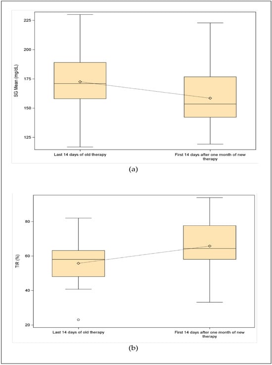 A visual representation of glycemic outcomes for the two periods is illustrated in Figure 3 using boxplots. These graphs highlight the positive impact of transitioning from standard MDI to Medtronic Smart MDI therapy. Specifically, Figure 3a demonstrates a reduction in SG mean, while Figure 3b shows an increase in TIR, both indicating improved glycemic management. The dotted lines in the plots connect the mean values for each period, emphasizing the changes achieved with the new therapy.