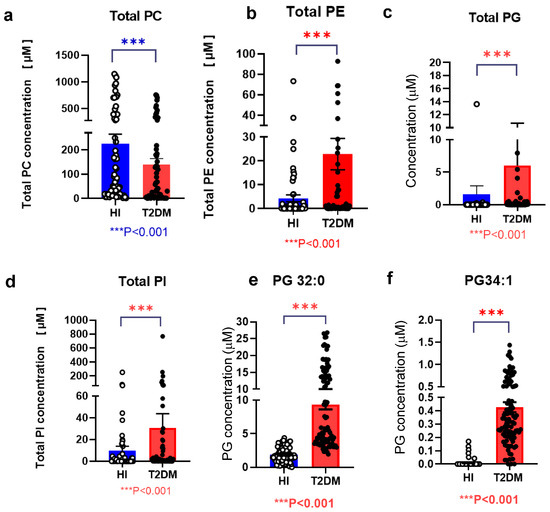Modulations of diacyl-glycerophospholipid serum levels of in patients with type 2 diabetes mellitus (T2DM) Total PC (a), PE (b), PG (c), PI (d), PG 32:0 (e), and PG 34:1 (f) serum levels are shown. Error bars represent the mean ± standard error of the mean (SEM). Statistical significance is indicated by *** p < 0.001, denoting comparison between patients with T2DM (T2DM, n = 95) and healthy control individuals (HI, n = 85). Healthy individuals are represented in blue; T2DM patients are represented in red.