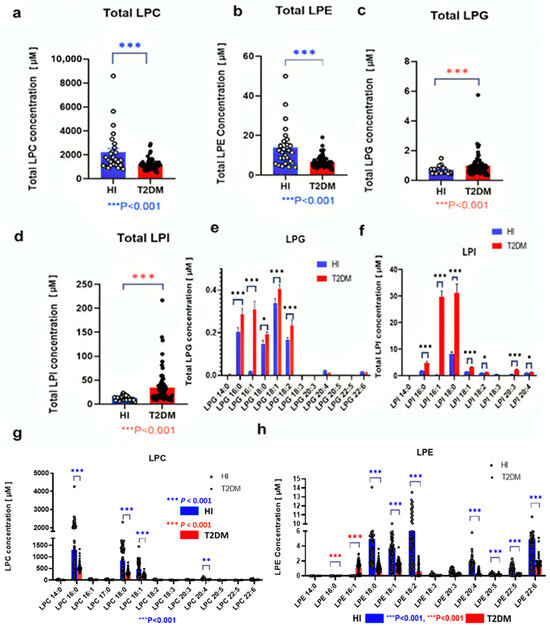 Modulations of glycerolysophospholipid serum levels in patients with T2DM The total serum levels of LPC (a), LPE (b), LPG (c), and LPI (d), along with the levels of individual molecular species of LPG (e), LPI (f), LPC (g), and LPE (h) are shown. Bars depict the mean ± SEM. Statistical significance is indicated by *** p < 0.001, ** p < 0.01, and * p < 0.05, denoting comparison between patients with T2DM (T2DM, n = 95) and healthy control individuals (HI, n = 85). The red and blue p-values were intentionally used to distinguish the relative significance of different group comparisons, blue for the Healthy Individual group and red for the T2DM group. Specifically, the asterisk annotations: *** p < 0.001, ** p < 0.01, and * p < 0.05, with blue representing the Healthy Individual group and red representing the T2DM group. For example, in Figure 2(g,h), significance levels for the Healthy group are shown in blue (e.g., *** p < 0.001 [blue], ** p < 0.01 [blue]), while those for the T2DM group are shown in red (e.g., *** p < 0.001 [red], ** p < 0.01 [red]).