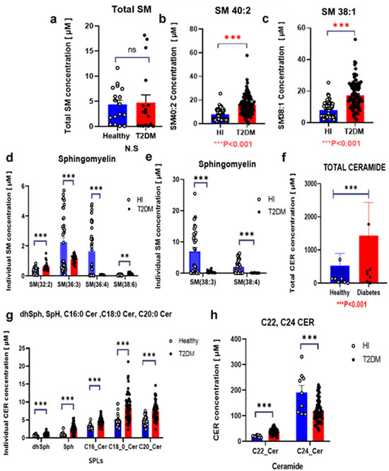 Modulations of serum sphingolipid levels in patients with T2DM The serum levels of sphingomyelins (SM) (a–e) and ceramides (CER) (f–h) are shown. Bars depict the mean ± SEM. Statistical significance is indicated by *** p < 0.001, ** p < 0.01, and, denoting comparison between patients with T2DM (T2DM, n = 95) and healthy control individuals (HI, n = 85). Healthy individuals are represented in blue; T2DM patients are represented in red.