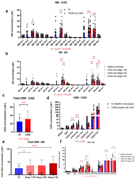 Associations between serum sphingolipid levels and diabetic complications in patients with T2DM Associations of serum levels of Sphingomyelins (SM) (a,b) and Ceramides (CER) (c–f) with Coronary Artery Disease (CAD) (a,c,d) or Diabetic Nephropathy (DN) stages 1–4 (b,e,f) are shown. Bars depict the mean ± SEM. *** p < 0.001, ** p < 0.01, and * p < 0.05. While the plotted means for C22:0 Cer and C24:0 Cer may appear similar across the groups due to axis scaling and threshold adjustments by GraphPad Prism, version 10.0.3, the underlying statistical analysis was performed using raw, unrounded data and confirmed significant differences. Healthy individuals are represented in blue; T2DM patients are represented in red.