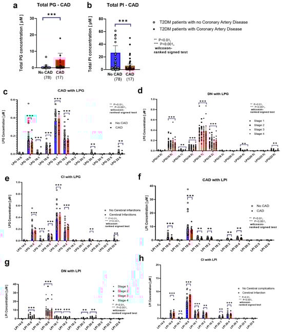 Regarding the relationship between LPG, LPI, PG, and PI levels with T2DM complications, of the 95 patients with T2DM, total PG levels were increased in 55 individuals with CAD (Figure 5a). Conversely, individuals with a history of CAD exhibited significantly lower total LPG levels and levels of specific LPG species, including LPG 16:0, LPG 18:0, LPG 20:4, and LPG 22:6, except for LPG 16:1 and LPG 18:1 (Figure 5c). Conversely, patients with T2DM with a history of cerebral infarctions (CIs) showed higher total LPG levels and levels of specific LPG species, including LPG 16:0, LPG 16:1, LPG 18:0, LPG 18:1, LPG 18:2, LPG 20:4, and LPG 22:6 (Figure 5e). Moreover, among participants with DN stages 1 and 4, higher LPG 16:0, LPG 16:1, LPG 18:0, LPG 18:1, LPG 18:2, LPG 20:4, and LPG 22:6 levels were observed in those with DN stage 4 (Figure 5d).