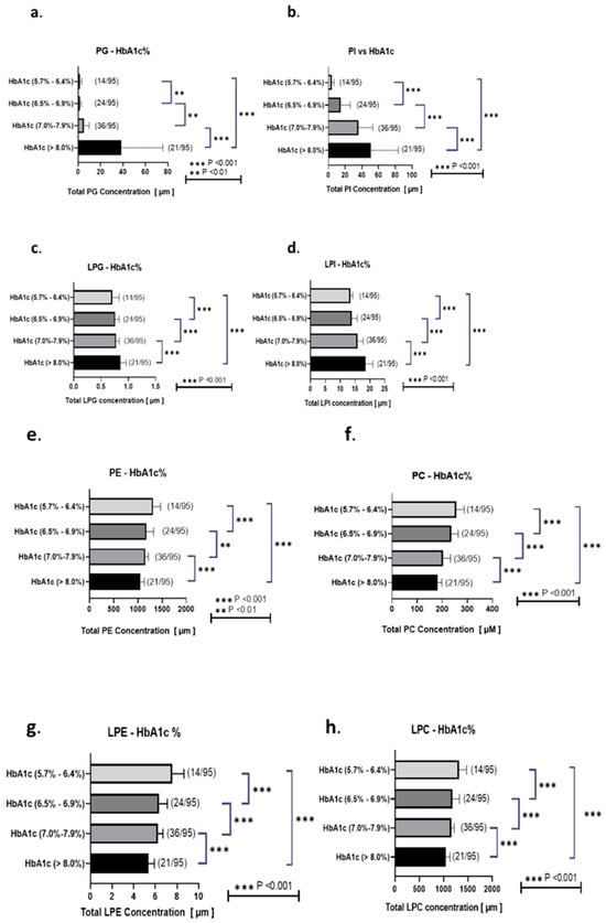 Associations of total PG, PI, LPG, LPI, PE, PC, LPE, and LPC levels with HbA1c Associations of total PG (a), PI (b), LPG (c), LPI (d), PE (e), PC (f), LPE (g), and LPC (h) levels with the ranks according to HbA1c levels (5.7–6.4%, 6.5–6.9%, 7.0–7.9%, and >8.0%). This study categorized participants on the basis of their HbA1c levels and noted 14, 24, 36, and 21 participants with diabetes having HbA1c levels of 5.7–6.4%, 6.5–6.9%, 7.0–7.9%, and >8.0%, respectively. Correlation ranking analyses were performed, and data were expressed as r2 correlation factors. Statistical significance was denoted as *** p < 0.001, ** p < 0.01. Healthy individuals are represented in blue; T2DM patients are represented in red.