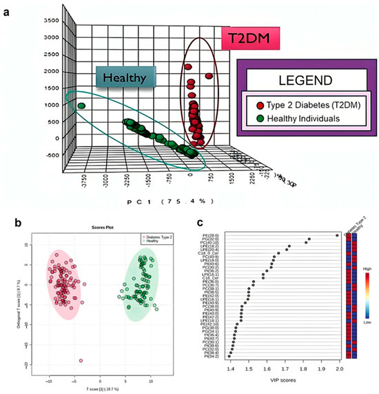 Comprehensive analysis of the associations between glycerophospholipids, sphingolipids, and T2DM Orthogonal partial least squares discriminant analysis was performed on the top metabolites identified in the variable importance of projection scores from the OPLS-DA model (a) of glycerophospholipids and sphingolipids present in both healthy control individuals and participants with T2DM. The response ranges of the participants with T2DM and healthy control individuals are depicted in red (T2DM) and blue (healthy), respectively. The T Score plot of the participants with T2DM and healthy control individuals (b) used the first two principal components obtained from patients with T2DM (n = 95) compared with healthy control individuals (n = 85), with T2DM represented in red and healthy control individuals in green. Principal component analysis (PCA) of glycerophospholipids and sphingolipids was performed to compare healthy control individuals and those with T2DM. The lipids with the top 40 highest VIP scores are shown (c).