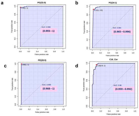 To discriminate between the T2DM and control groups, ROC analyses were conducted. Of note, the results showed high AUC values for PG 32:0 (AUC: 0.998) (Figure 8a), PG 34:1 (AUC: 0.984) (Figure 8b), PE 28:0 (AUC: 0.989) (Figure 8c), and C16:0 Cer (AUC: 0.980) (Figure 8d). Collectively, these findings suggested that glycerophospholipids including PG 32:0, PG 34:1, and PE 28:0, along with C16:0 Cer, could serve as highly suitable potential biomarkers for T2DM.