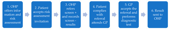 The routine clinical consultation follows a predictable sequence, comprising tasks that must be accomplished within a limited timeframe [35]. OHPs expressed uncertainty where the steps associated with screening would fit within this traditional dental consultation model. (COM-B construct: physical opportunity; TDF domain: environmental context and resources). Additionally, OHPs identified the risk discussion and medical referral as the most time-consuming tasks in the screening process. Disruption of the normal operation of the dental practice [36], the additional time needed to screen [37], and the lack of financial incentive [38,39] have previously been identified as obstacles to an HCP’s screening participation.