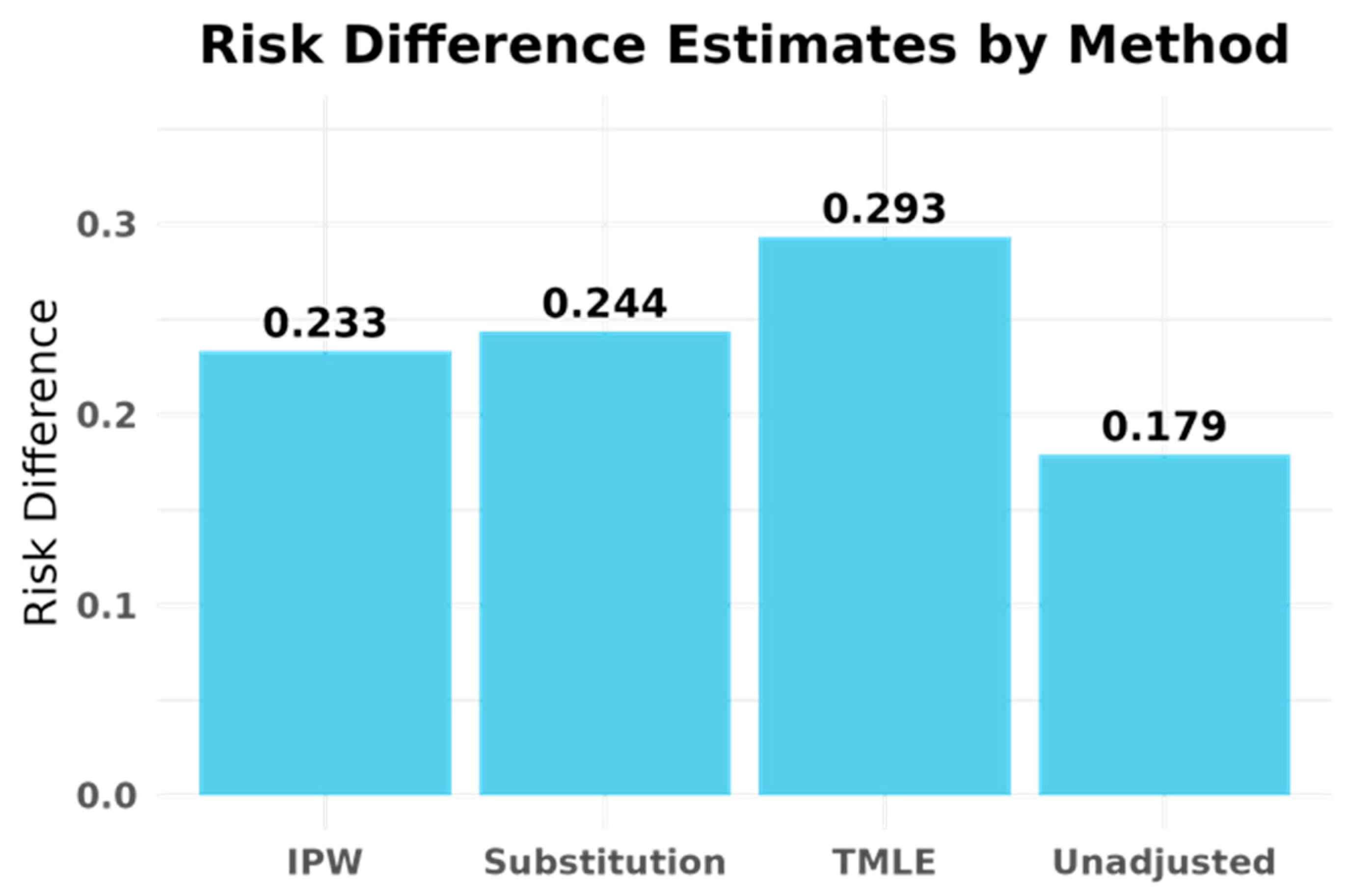 | TMLE | 29.30% | [19.6–39.1%] | [20.5–39.6%] | Targeted Maximum Likelihood |