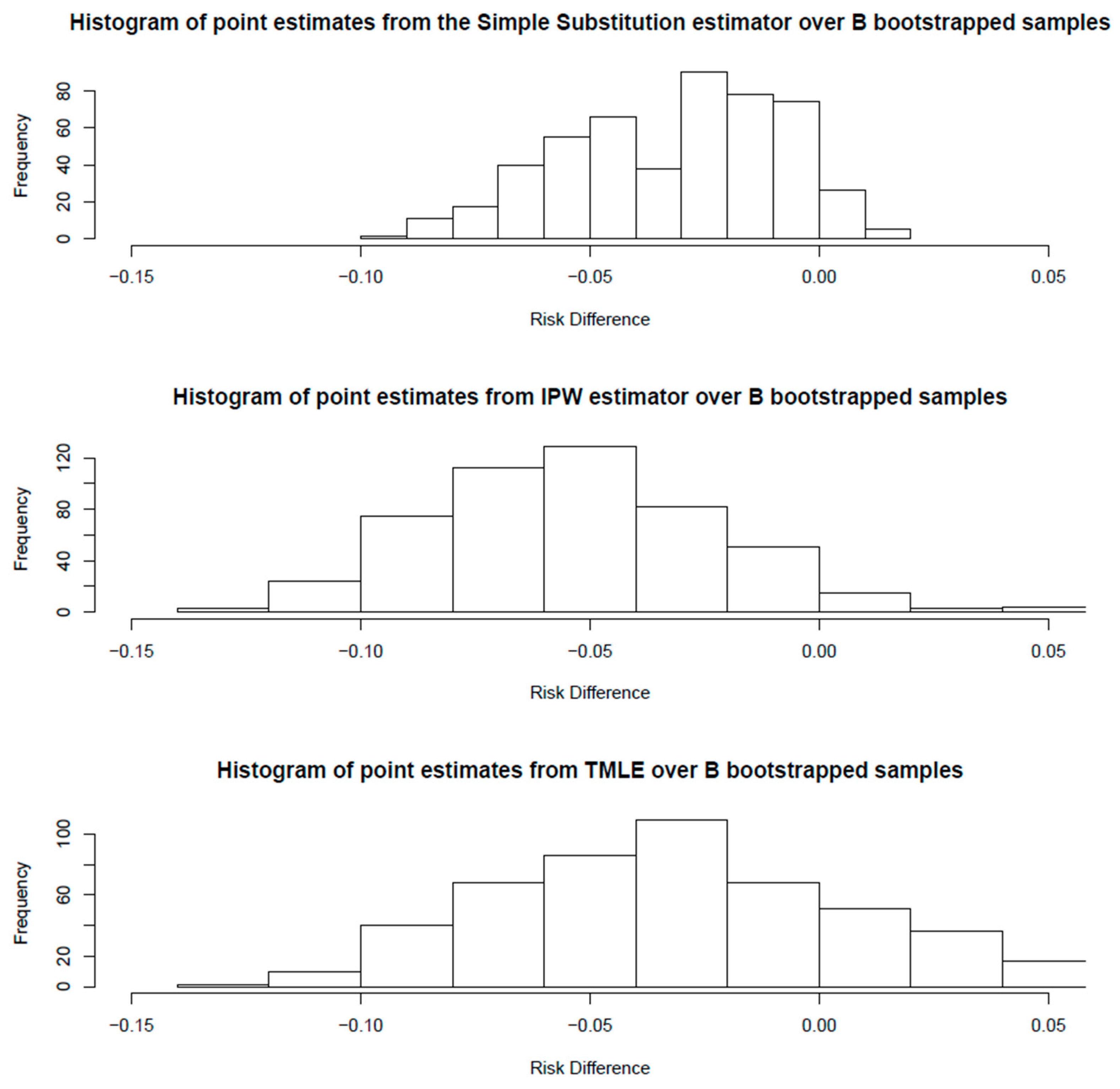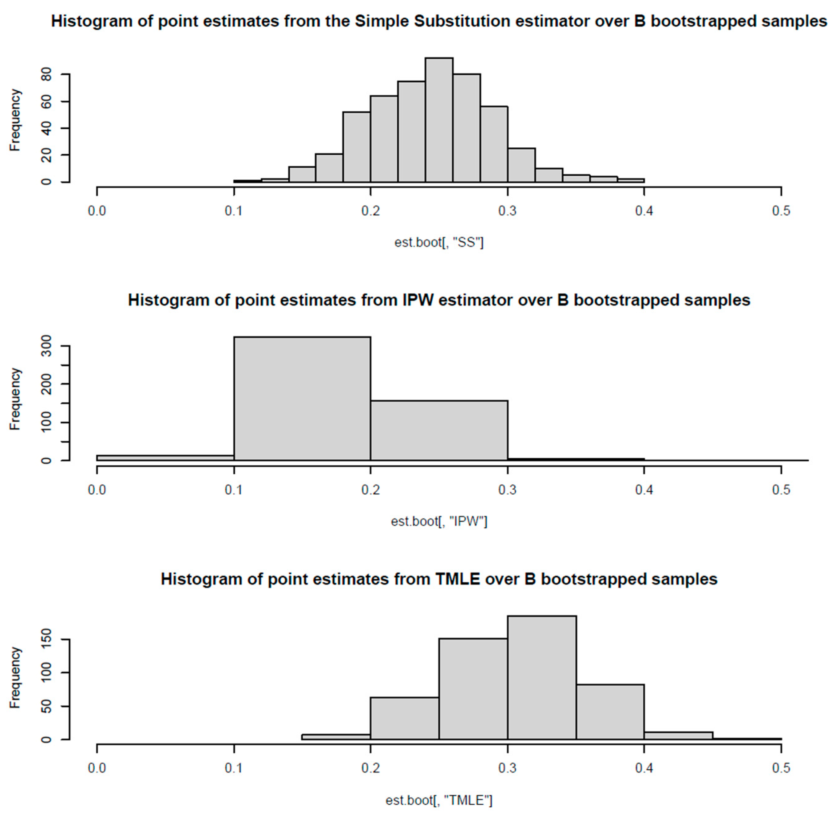 - TMLE: Mean bootstrap estimate = 0.306 (range: 0.162–0.452).
