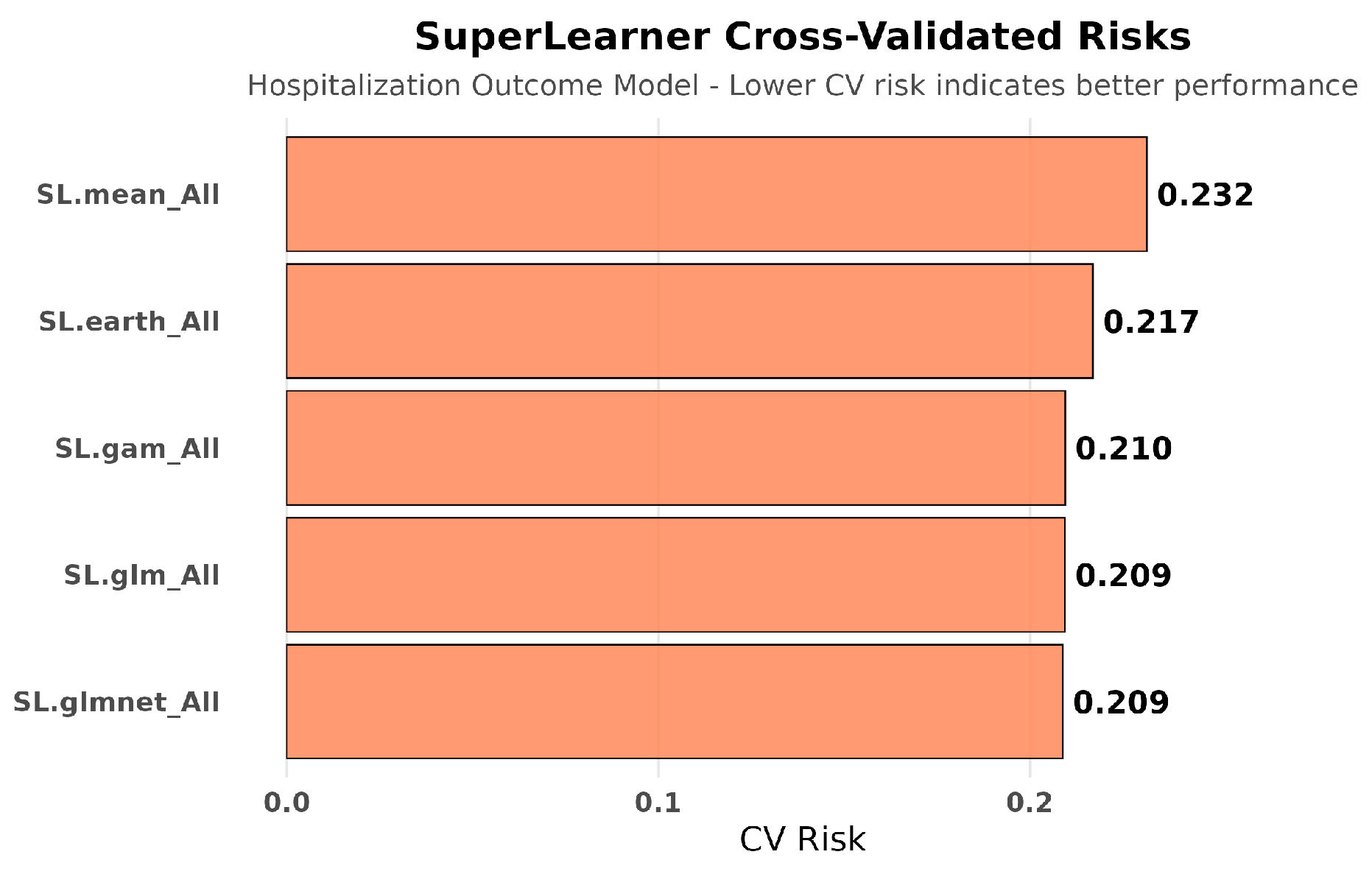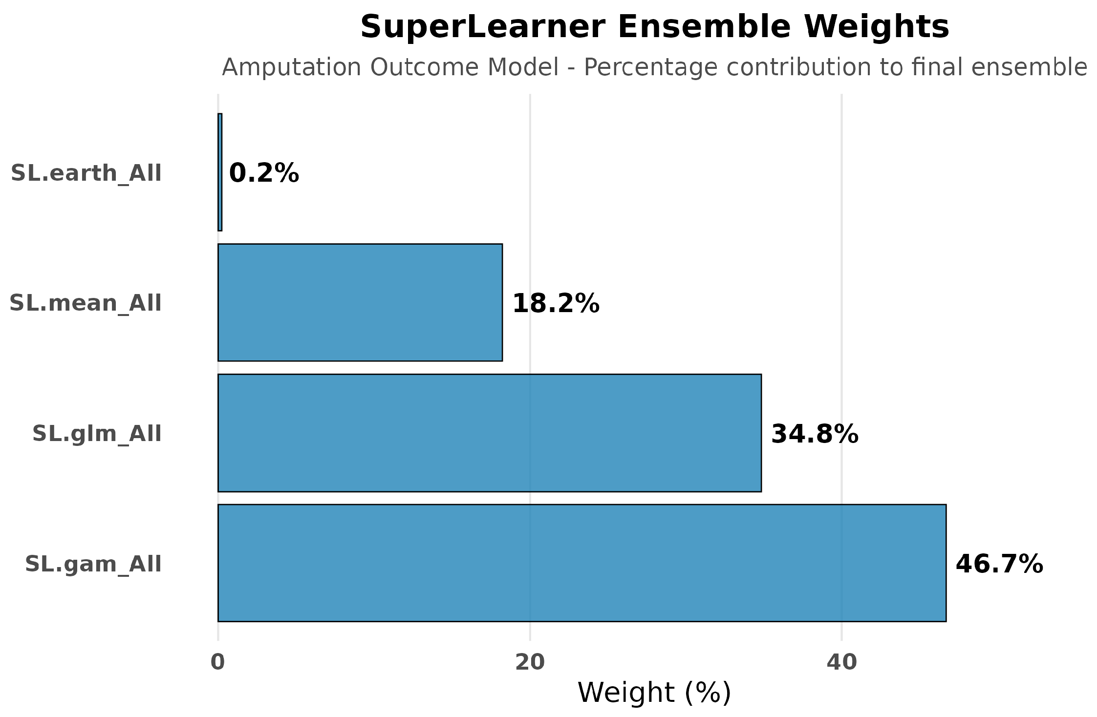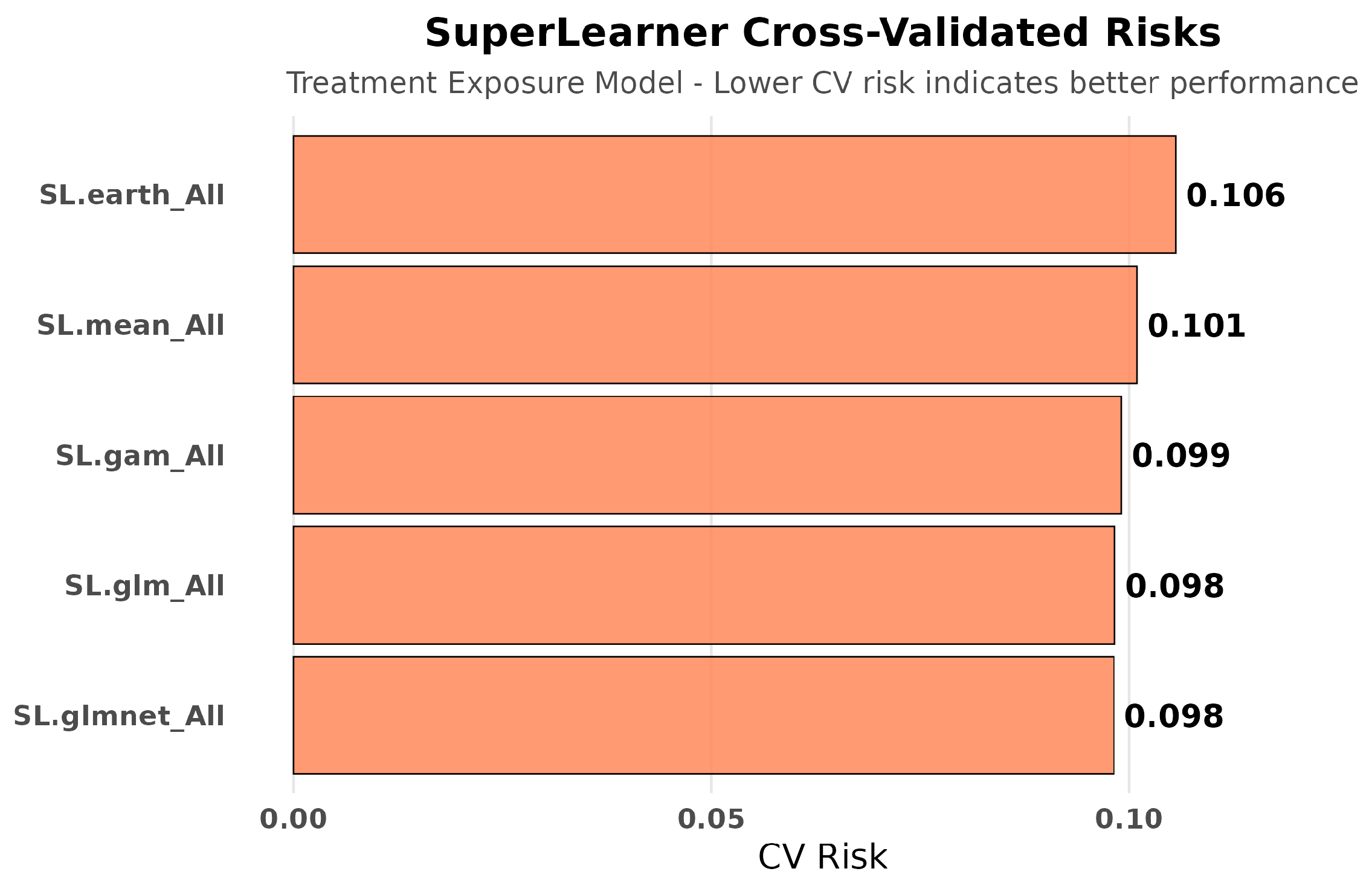 - Outcome regression modeling: Estimated E[Y|A,W] using SuperLearner to predict outcome probability under both treatment conditions.