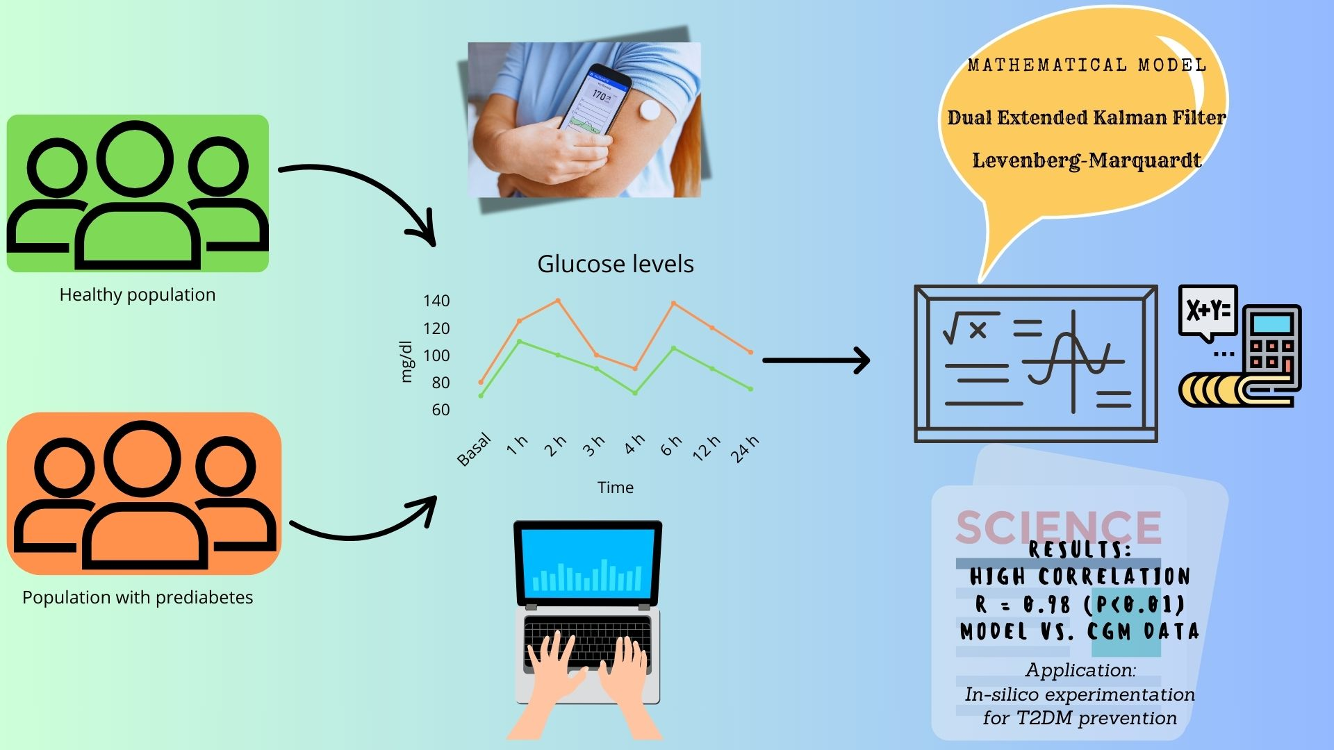 - Mathematical modeling: To start the model, a mathematical representation of glucose homeostasis was generated. Using experimental data, glucose signals were processed, and key model parameters and variables were estimated. Local minima for these parameters were then calculated, and the model was validated using correlation and error analyses, comparing measured values with model approximations.