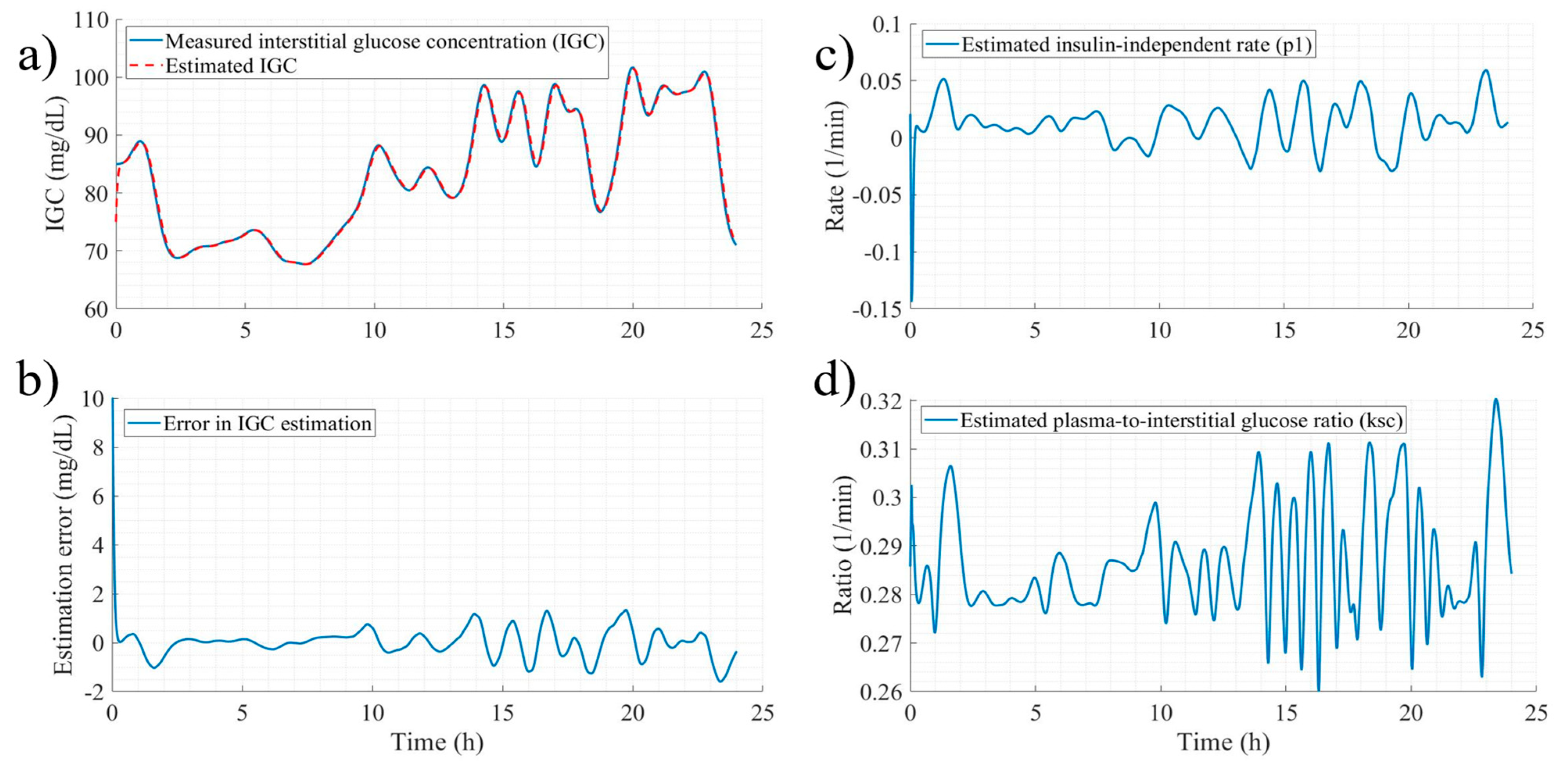 - System Configuration for DEKF Estimation: The estimated states are , with parametric uncertainty addressed individually for each participant. For healthy individuals, the parameters are ; for those with prediabetes, . The system input is , and measurable outputs are . Notably, since only interstitial glucose is measured, is considered with a 15-min lead relative to , following Stout et al. [48].