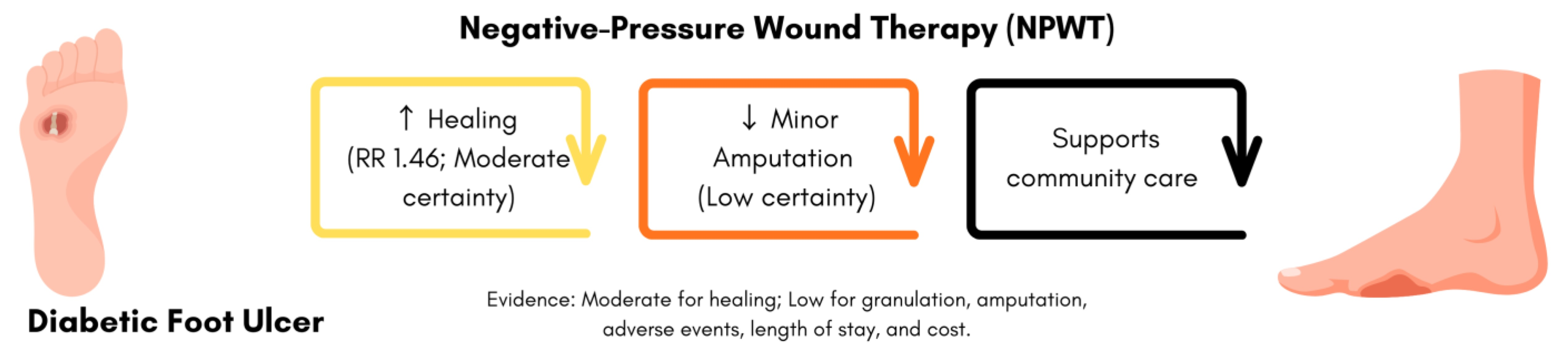 - Exclusion criteria: Non-randomized designs; mixed-etiology ulcers without separable DFU data; prophylactic NPWT after surgical closure; abstracts without full text; duplicate or overlapping reports; and ulcers not related to diabetes.