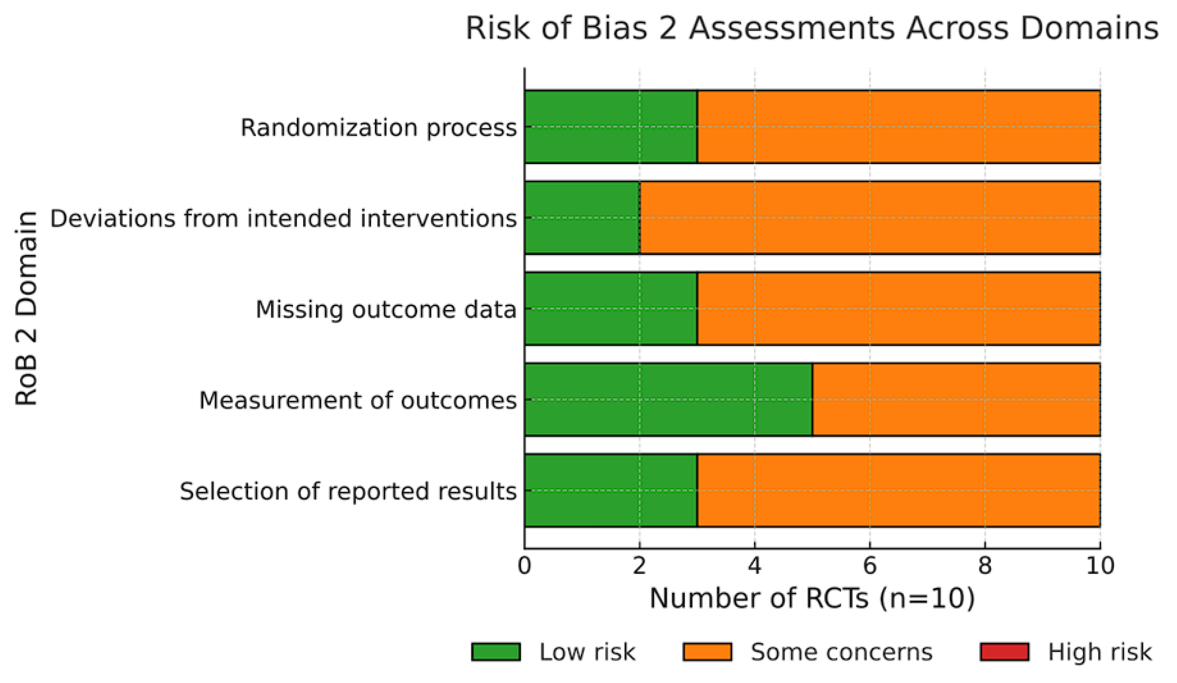 - Risk of bias: seven trials rated as some concerns or high risk;