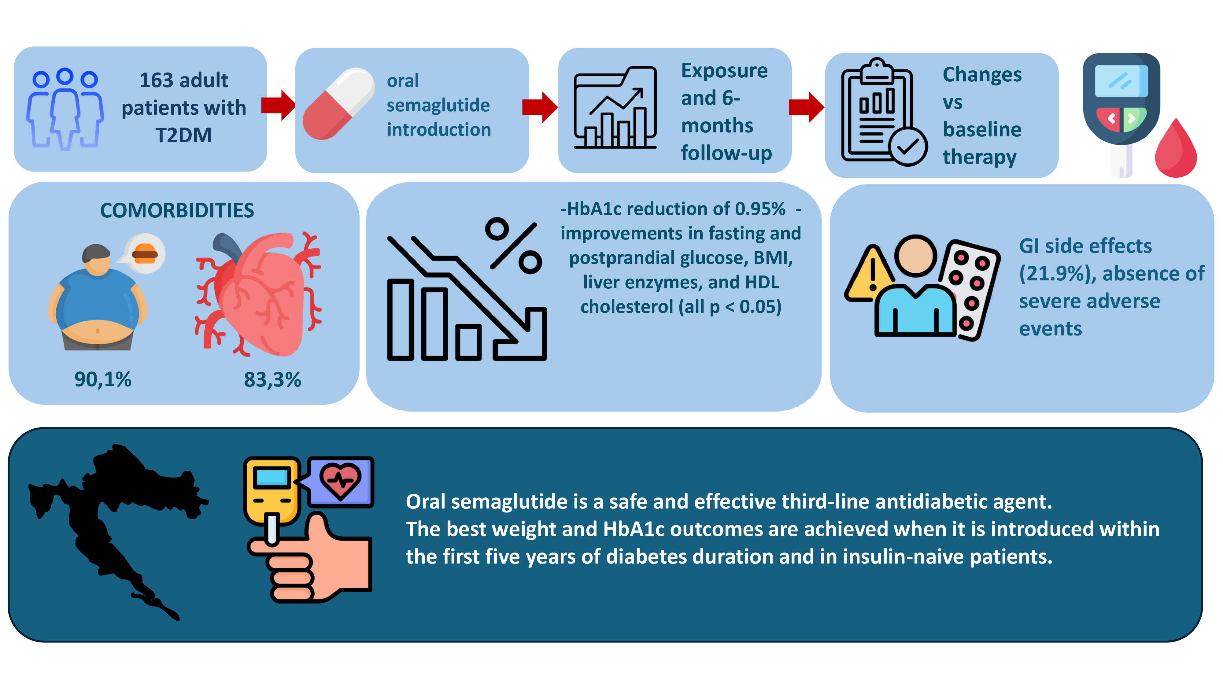 This multicentric, real-world study conducted in Croatia demonstrates that oral semaglutide is effective and well-tolerated as a third-line treatment in routine clinical practice. It leads to clinically significant improvements in glycemic control and body weight among patients with type 2 diabetes