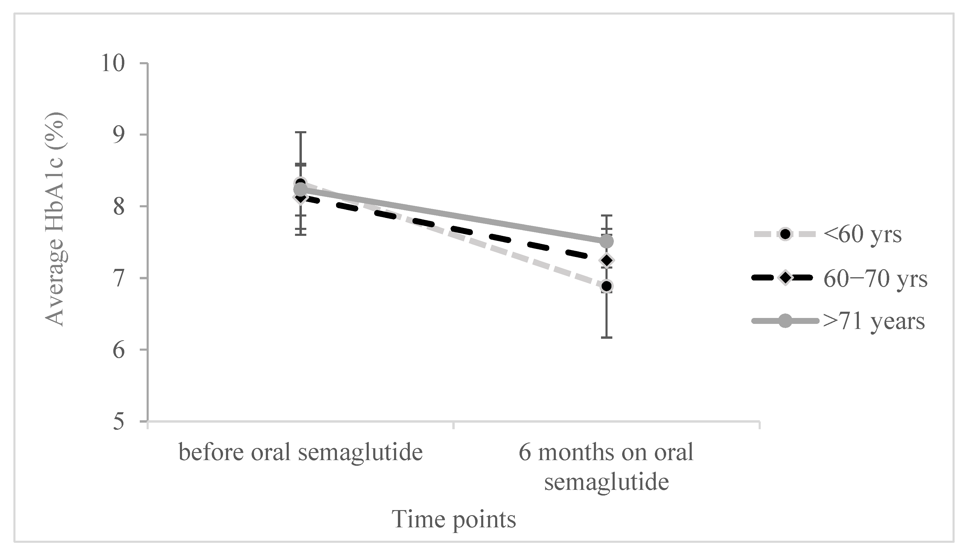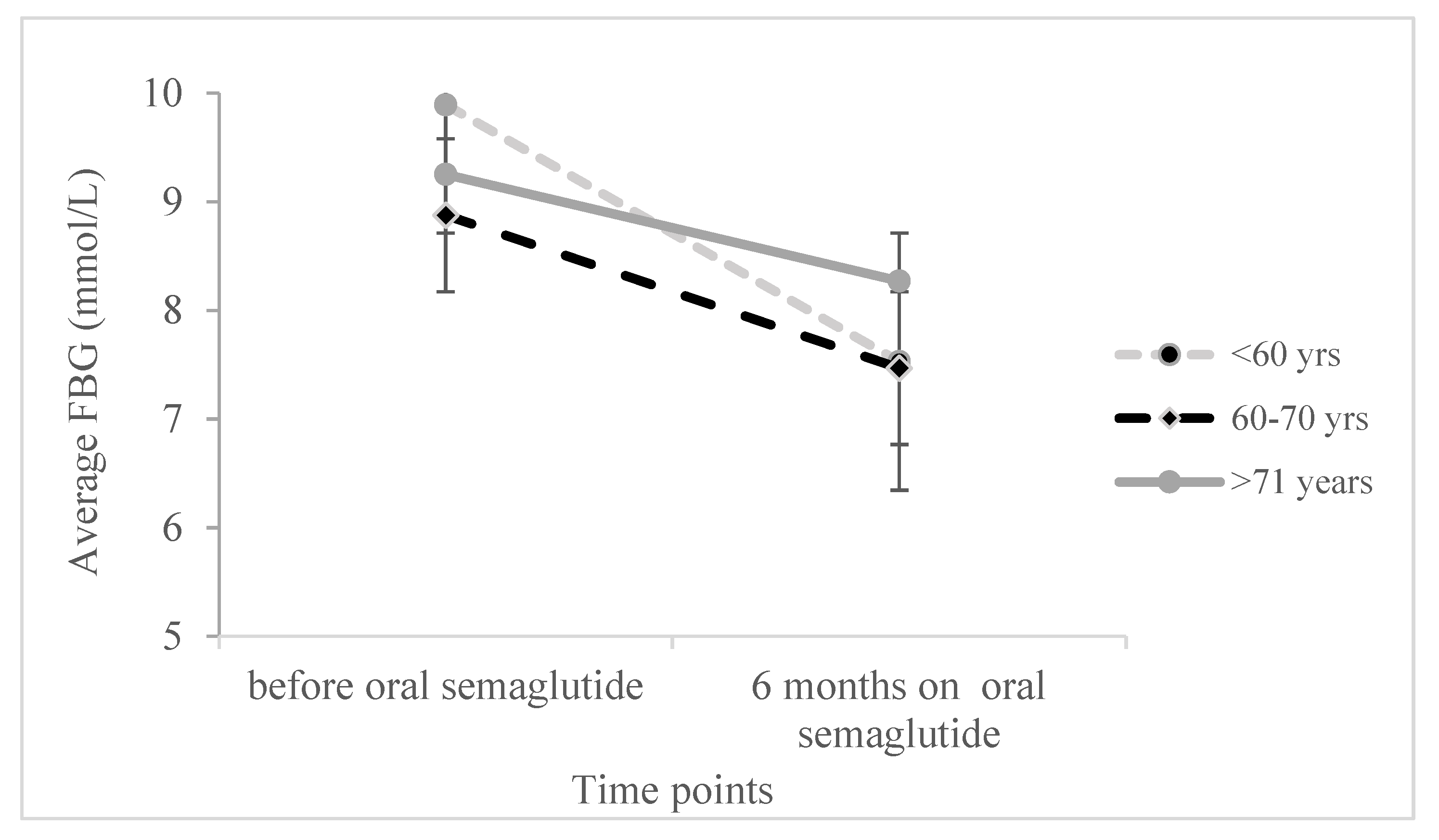 11]. However, age-based subgroup analyses using two-way repeated measures ANOVA revealed important interaction effects. Patients under 60 years exhibited significantly greater reductions in HbA1c, BMI, and fasting glucose levels, indicating a more robust response in younger individuals. While the main effect of age was not statistically significant when controlling for diabetes duration and sex, the age-by-time interaction was significant for key parameters. This suggests that while older patients can still benefit from oral semaglutide, earlier initiation may yield more pronounced improvements, a finding confirmed in prior studies such as PIONEER 7 and IGNITE [