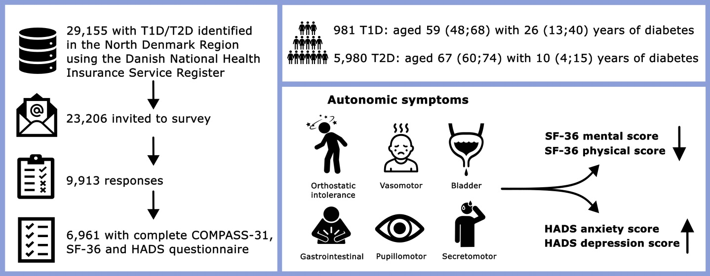 - Bitsch Poulsen, M.; Wegeberg, A.-M.; Røikjer, J.; Nikontovic, A.; Vestergaard, P.; Brock, C. Prevalence of self-reported symptoms of diabetic autonomic dysfunction in the North Denmark Region: A population-based survey. Acta Diabetol. 2025, 62, 707–716. [Google Scholar] [CrossRef] [PubMed]