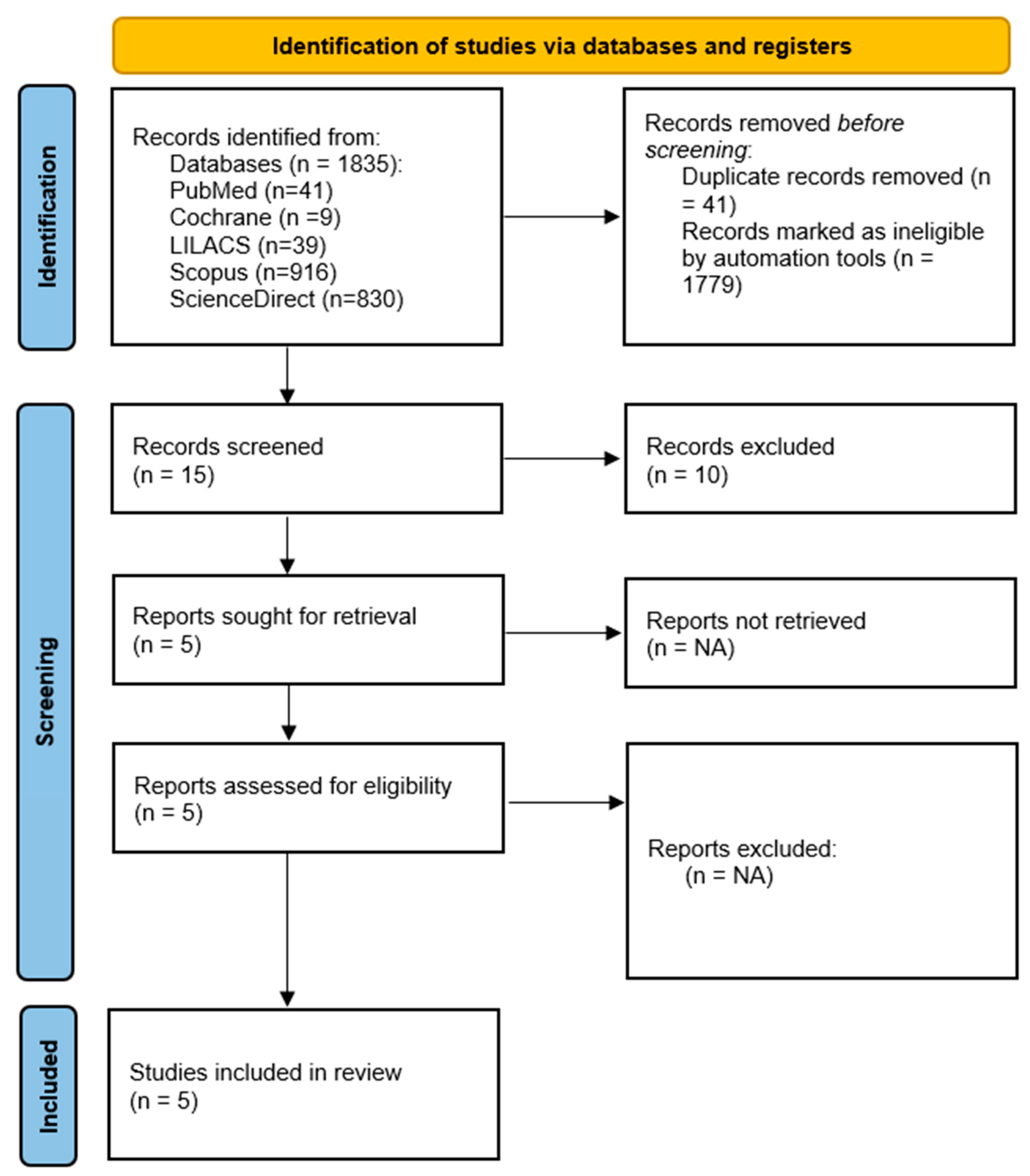 In total, 1835 records were retrieved from multiple databases including MEDLINE (41), Cochrane Library (9), LILACS (39), Scopus (916) and ScienceDirect (830). After removing duplicates (41 records) and records marked as ineligible by automatic tools (1779), 15 records were included in the screening process. After full-text reading, 5 articles were taken into consideration in the systematic review. Figure 1 summarizes the PRISMA flow diagram.