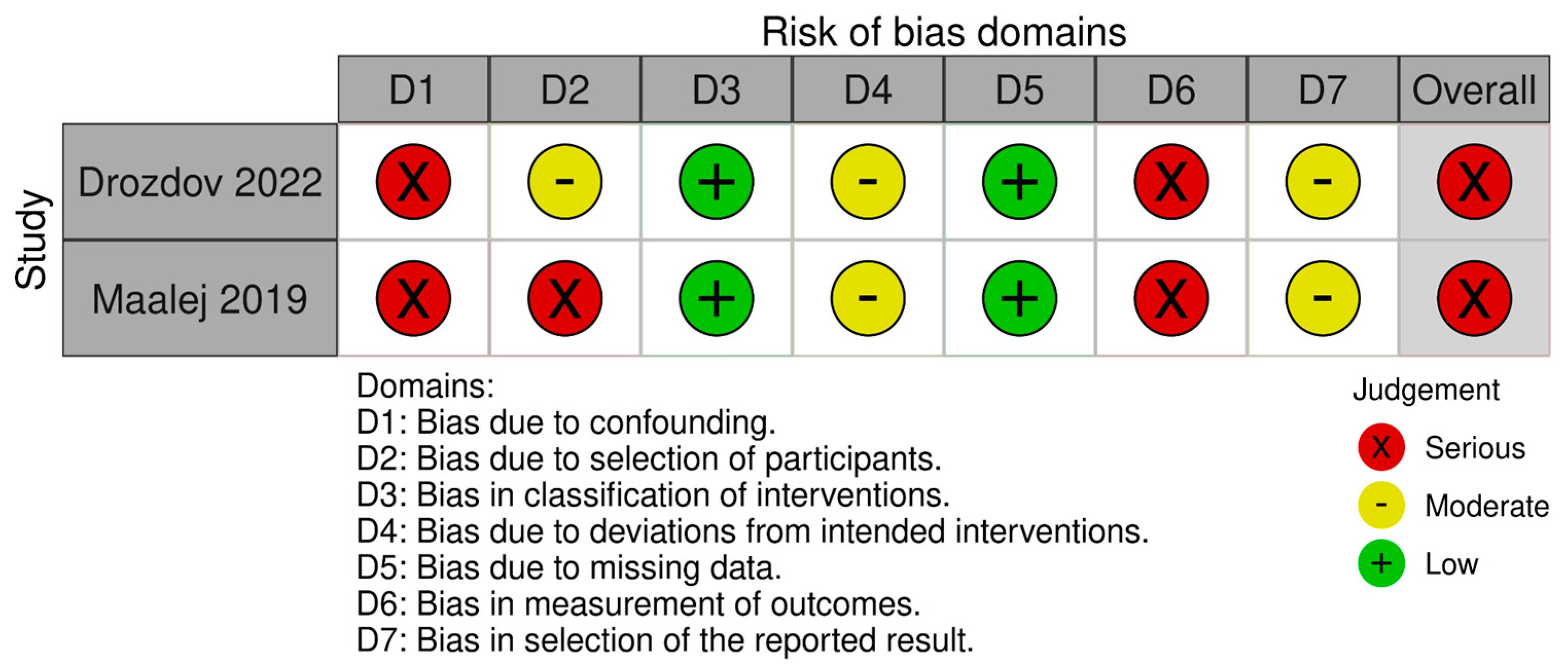 Figure 3. Risk of bias assessment for non-randomized studies: graphical summary of the ROBINS-I risks of bias assessment for two non-randomized intervention studies: Drozdov et al. [8] and Maalej et al. [25]. Both studies were judged to have a serious overall risk of bias, primarily due to confounding factors and selection of participants. Domains assessed included confounding (D1), selection of participants (D2), classification of interventions (D3), deviations from intended interventions (D4), missing outcome data (D5), measurement of outcomes (D6), and selection of the reported result (D7). Color-coded judgments indicate risk level: green (low), yellow (moderate), and red (serious).
