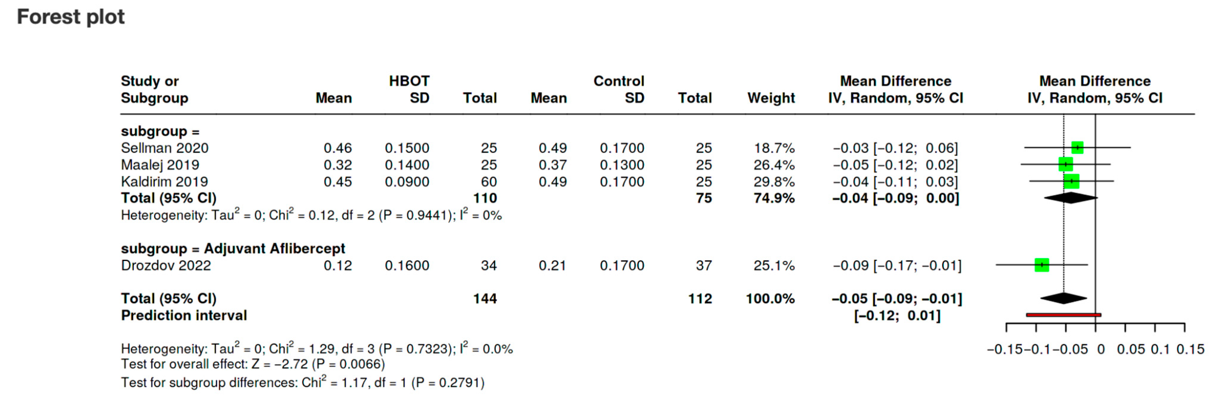 The meta-analysis aimed to evaluate the effect of hyperbaric oxygen therapy (HBOT) on best-corrected visual acuity (BCVA) and Central Macular thickness (CMT) in patients with diabetic retinopathy (DR) and diabetic macular edema (DME).