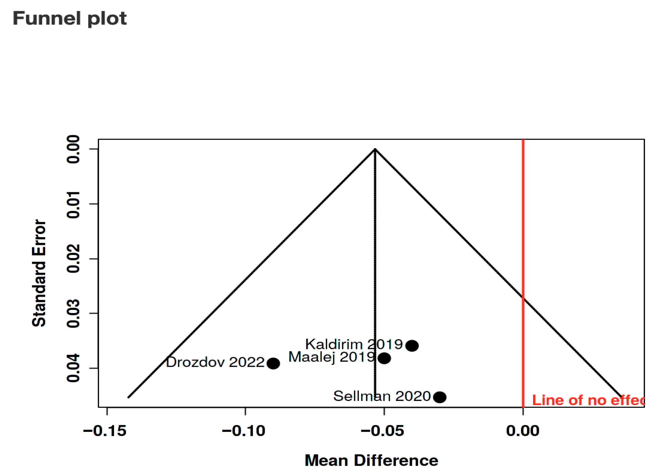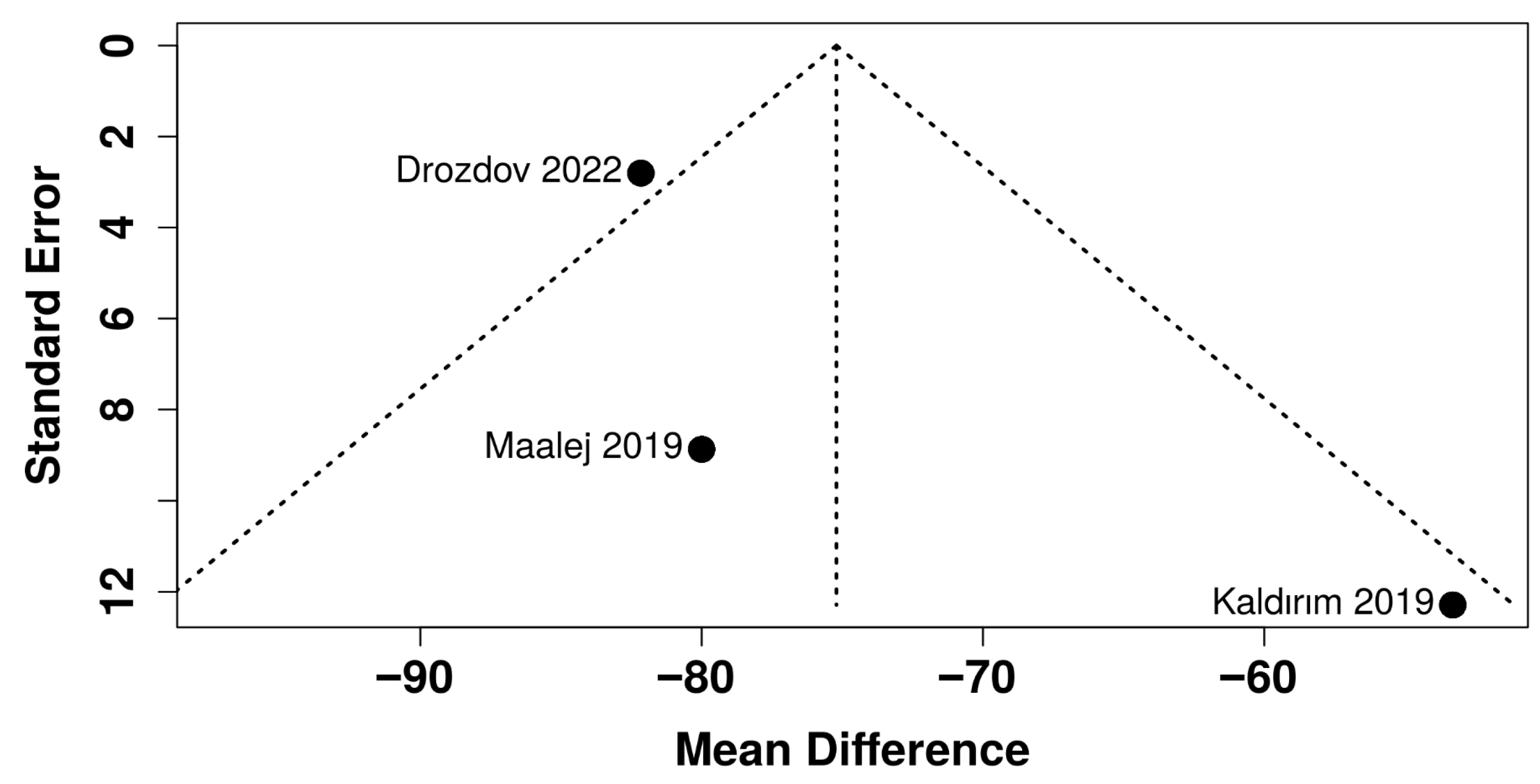 Figure 7. Funnel plot—Publication-bias assessment for CMT outcome. Each dot is an individual study plotted against its standard error. Maalej et al., 2019 [25]; Drozdov et al., 2022 [8]; and Kaldirim et al., 2019 [26].